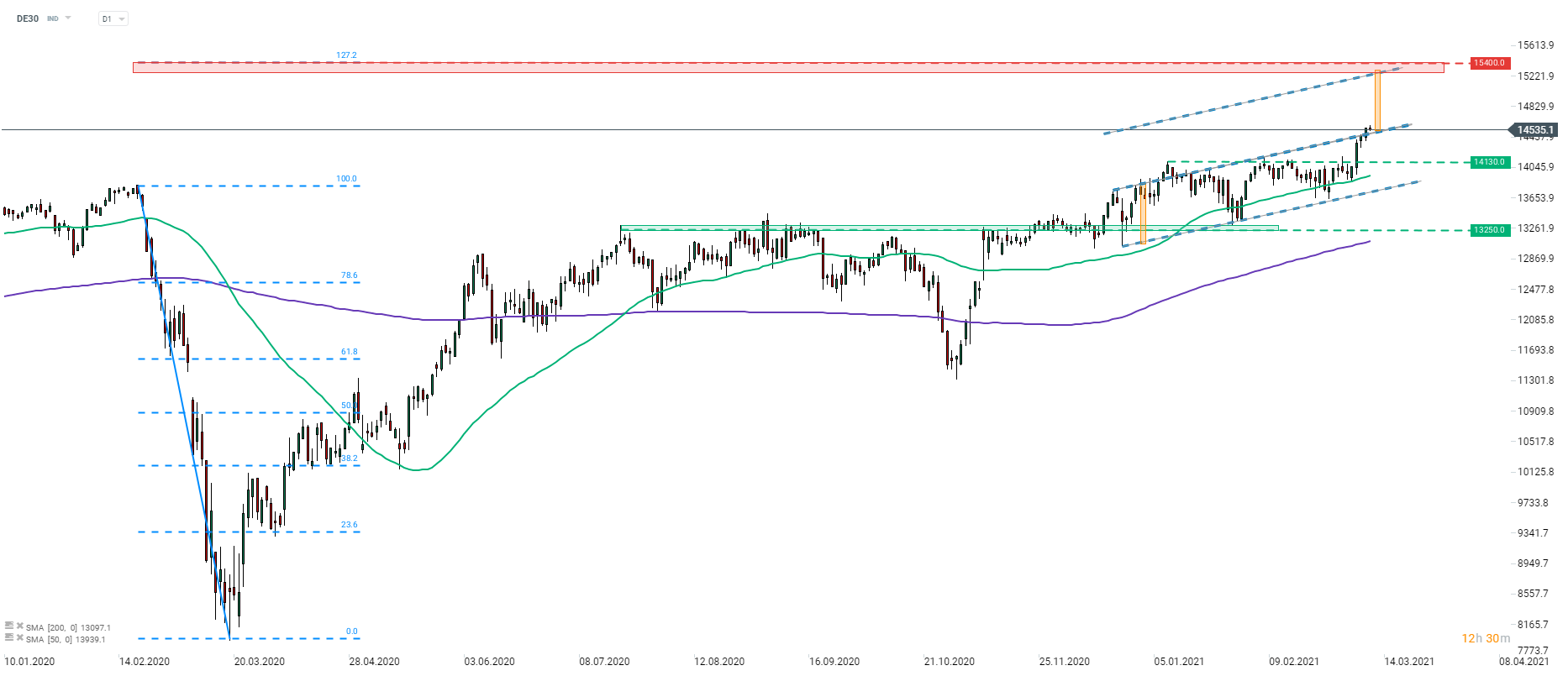 Situația pe piața DE30 nu este foarte diferită față de ziua de ieri. Indicele a reușit să facă o spargere minoră peste limita superioară a canalului ascendent, dar rămâne aproape de acesta. Indicele a marcat astăzi un nou maxim istoric aproape de 14.590 puncte, dar a pierdut deja toate câștigurile. Primul suport major de urmărit în cazul în care retragerea continuă se află la 14.130 puncte. Sursa: xStation5
