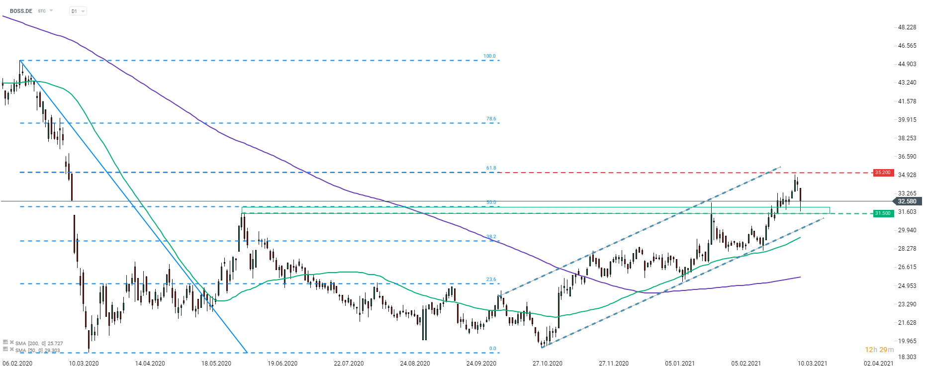 Hugo Boss (BOSS.DE) a oprit o mișcare ascendentă în această săptămână după o încercare eșuată de a depăși retragerea Fibonacci de 61,8% a scăderii cauzate de pandemie, aflată în zona de 35,20 EUR. Scăderea de astăzi a fost oprită până acum în zona de suport situată deasupra nivelului de 35,00 EUR. În cazul în care vom vedea o spargere în jos a acestui suport, investitorii ar trebui să se concentreze asupra limitei inferioare a canalului ascendent. Sursa: xStation5