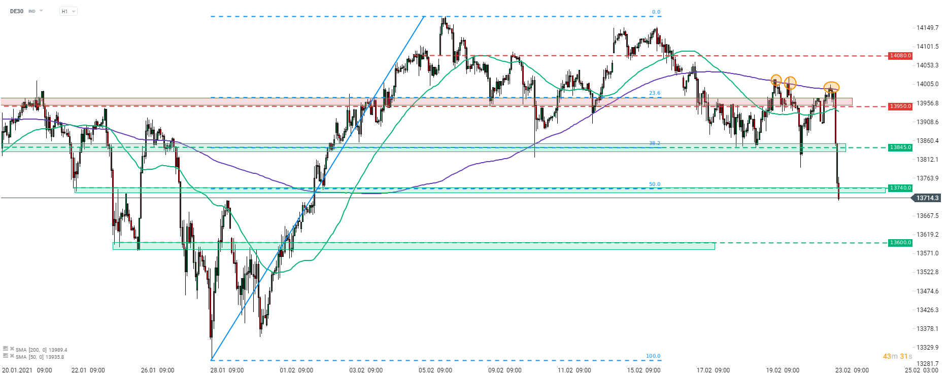 DE30 a încercat din nou să depășească media mobilă de 200 de ore (linia mov) în cursul sesiunii de tranzacționare asiatice. Cu toate acestea, indicele german nu a reușit să treacă peste acest obstacol (cercuri portocalii) și a urmat o puternică mișcare descendentă. În timp ce sesiunea de tranzacționare europeană a fost deschisă ușor peste nivelul de închidere de ieri, indicele se tranzacționează acum cu 1,4% mai jos, la un nou minim al ultimelor 3 săptămâni. DE30 testează zona de suport de la 13.740 de puncte, marcată de retragerea Fibonacci de 50% a mișcării ascendente începută la sfârșitul lunii ianuarie. În cazul în care vedem o mișcare decisivă sub această zonă, drumul spre suportul de la 13.600 va fi deschis.