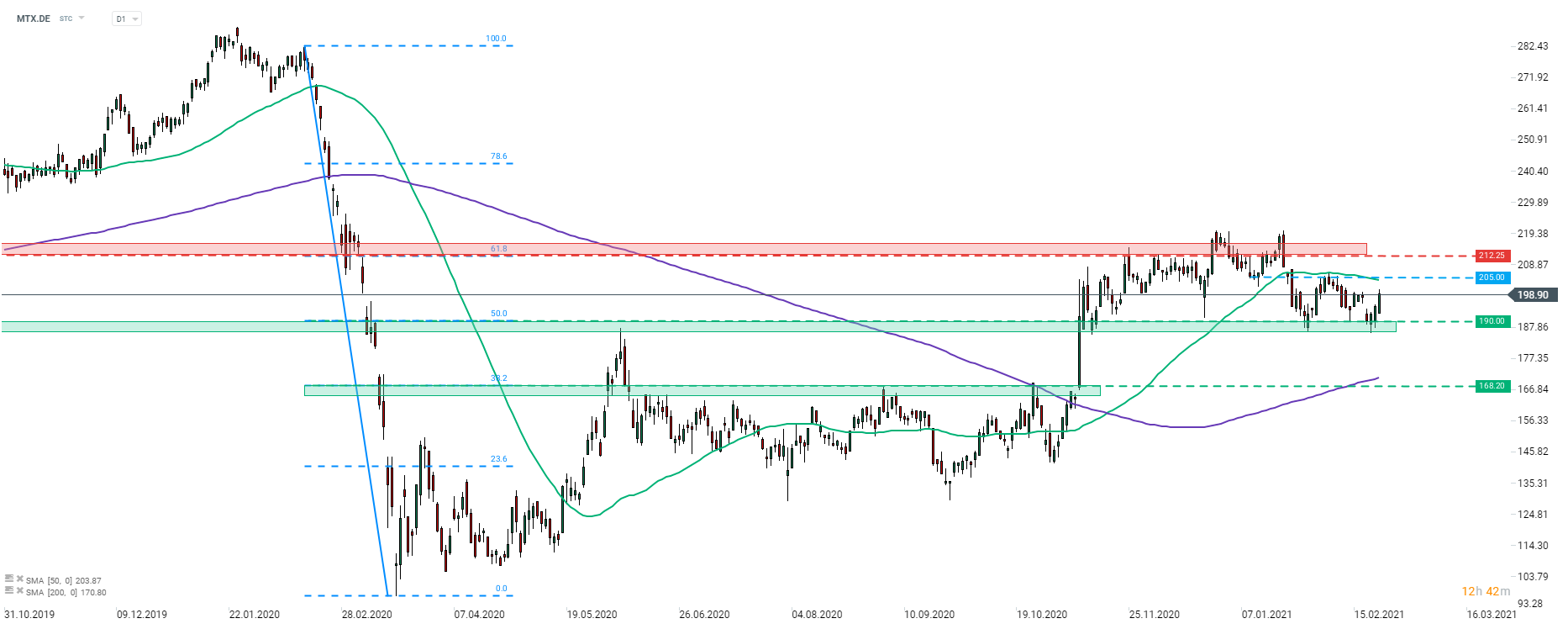 MTU Aero Engines (MTX.DE) se tranzacționează în creștere în urma unei promovări din partea Berenberg. Prețul a desenat o formațiune de tip Double Bottom la aproximativ 186,50 EUR. Rezistența formațiunii poate fi găsită la 205 EUR. În cazul în care prețul depășește acest nivel, o mișcare ascendentă către noile maxime post-pandemice, deasupra pragului de 220 EUR, poate fi posibilă. Sursa: xStation5