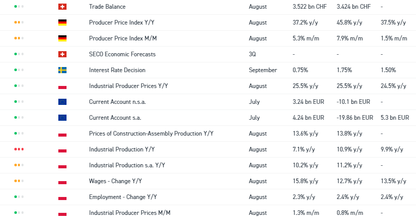 Sesiunea de tranzacționare de marți în Europa aduce scăderi ale majorității indicilor. DE30 pierde în prezent aproape 0,8%, FRA40 scade cu 0,9%, iar UE50 se depreciază cu 0,7%. Inflația PPI din Germania a crescut lunar cu 7,9% în august, față de previziunile de 1,5% MoM. Pe o bază anuală, inflația a crescut cu 45,8% față de previziunile de 37,5% YoY.