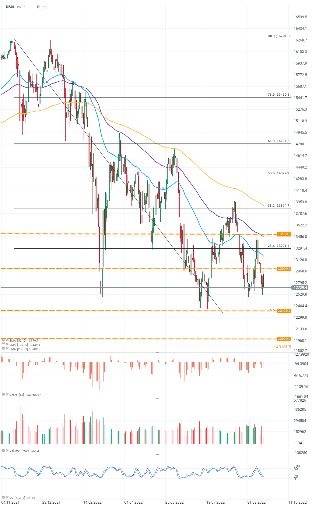 Graficul indicelui DE30, interval D1. Indicele german se tranzacționează în scădere astăzi și coboară către minimele locale din septembrie. Sursa: xStation 5