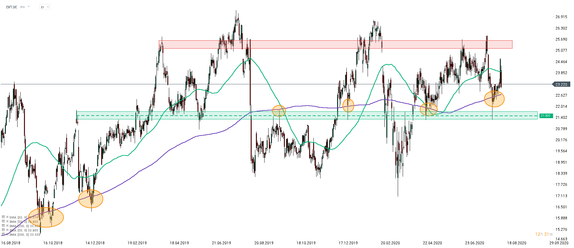 Evotec (EVT.DE) revine astăzi sub media mobilă de 50 de perioade (linia verde). Suportul principal de urmărit în cazul în care declinul continuă este media mobilă de 200 de perioade (linia violet). Acest obstacol tehnic a fost adesea respectat de preț (zonele portocalii), dar dacă în eventualitatea unei spargeri descendente, zona de la 21,50 EUR poate fi în pericol. Sursa: xStation5