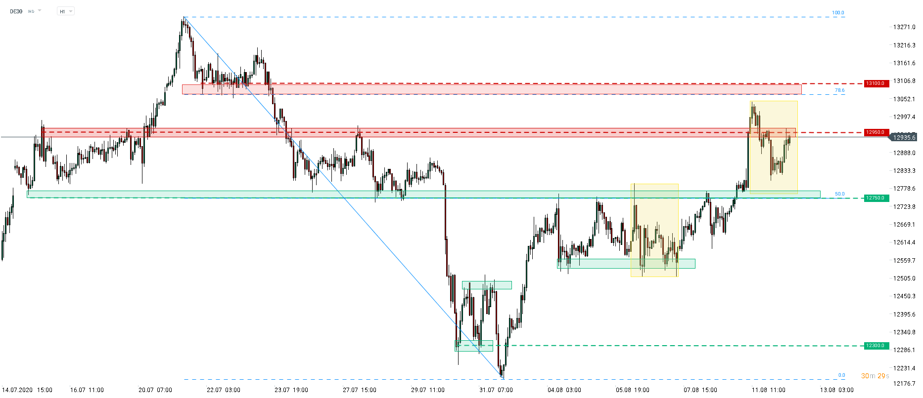 DE30 scăzut în cursul noapții, dar recuperarea este în curs. Indicele a marcat un minim zilnic la 12802 de puncte în timpul sesiunii asiatice și a reușit să urce deasupra 12900 de puncte la începutul sesiunii europene. Prețul testează zona de rezistență din jurul nivelului de 12950 de puncte de la deschiderea sesiunii de numerar, dar taurii au pierdut din elan și se pare că nu reușesc să împingă prețul deasupra acesteia. Zona principală de suport pe care ar trebui să o urmărim dacă vedem o retragere de la nivelurile actuale care depășește 12750 de puncte. Zona este marcată de retragerea Fibonacci de 50% a corecției de la sfârșitul lunii iulie și de limită inferioară a geometriei pieței (mărimea celei mai mari corecții din impulsul ascendent actual). Pe de altă parte, dacă vedem o spargere deasupra zonei de la 12950 de puncte, DE30 ar putea porni un alt test al nivelului de 13000 de puncte. Nu există rapoarte care să aducă volatilitate în piață programate pentru astăzi, astfel încât știrile și sentimentele de piață vor juca un rol important.