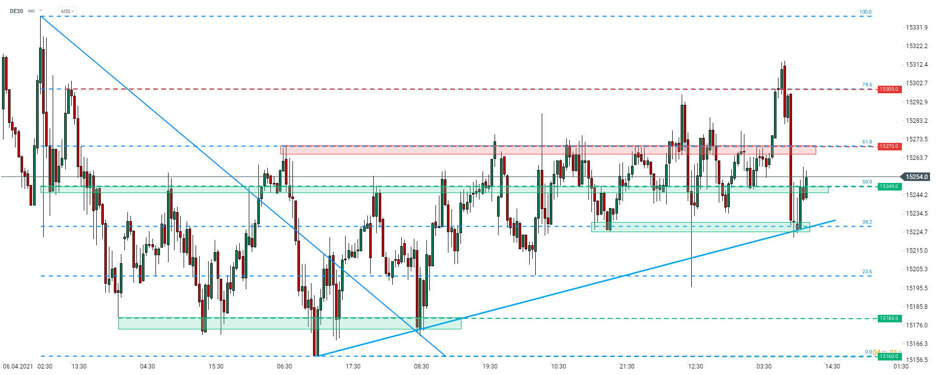 DE30 a depășit maximul de ieri înainte de începerea sesiunii de tranzacționare de astăzi. Cu toate acestea, indicele nu a reușit să rămână deasupra retragerii Fibonacci de 78,6% de la 15.300 puncte pentru o perioadă lungă de timp și ulterior s-a retras. Prețul a fost împins în jos până la retragerea Fibonacci de 38,2% a unei corecții recente (zona de 15.228 puncte), unde declinurile au fost oprite. În zonă se găsește și o linie ascendentă de trend. DE30 a început mișcarea de recuperare și acum testează zona de preț din zona retragerii Fibonacci de 50% (15.249 puncte). În cazul în care mișcarea ascendentă continuă, nivelurile de rezistență pe termen scurt pot fi găsite la 15.270 puncte (retragerea Fibonacci de 61,8%) și zona menționată anterior de 15.300 puncte.