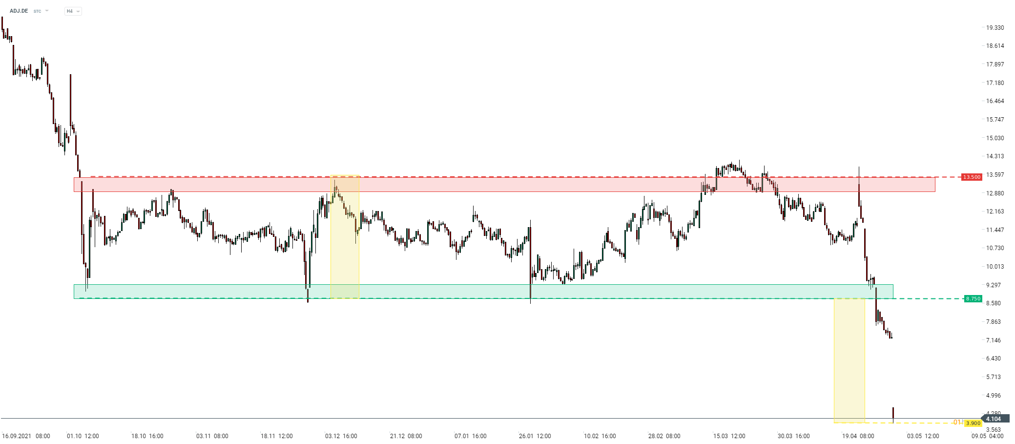Prețul acțiunilor Adler Group (ADJ.DE) a scăzut astăzi cu peste 40%, după ce KPMG a declarat că nu poate oferi o opinie de audit. Acțiunile au atins un interval de spargere negativă de manual dintr-un interval de tranzacționare recent, aproape de 3,90 EUR. Scăderile au fost oprite pentru moment iar acțiunile au revenit peste 4,00 EUR per acțiune. Cu toate acestea, este încă în scădere cu 43% în ziua de azi și cu 62% mai jos față de începutul anului. Sursa: xStation5