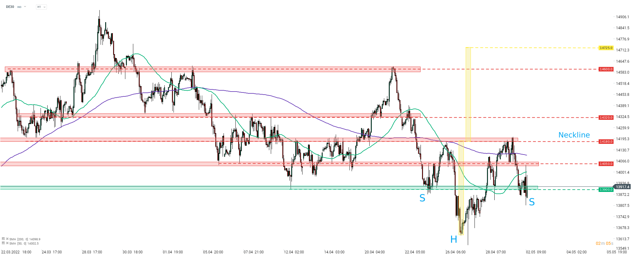Situația tehnică pe DE30 este puțin schimbată față de vineri. Un model inversat de Head and Shoulders este încă în joc. În prezent, indicele încearcă să ricoșeze din zona de 13.900 de puncte, unde a fost trasat umărul drept al modelului. Neckline-ul modelului, care este, de asemenea, o rezistență cheie de urmărit în cazul în care redresarea se extinde, poate fi găsit în zona de 14.180 de puncte. Intervalul de manual al unei spargeri în sus din acest model indică o potențială creștere de 3,8% și o mișcare peste 14.700 de puncte.