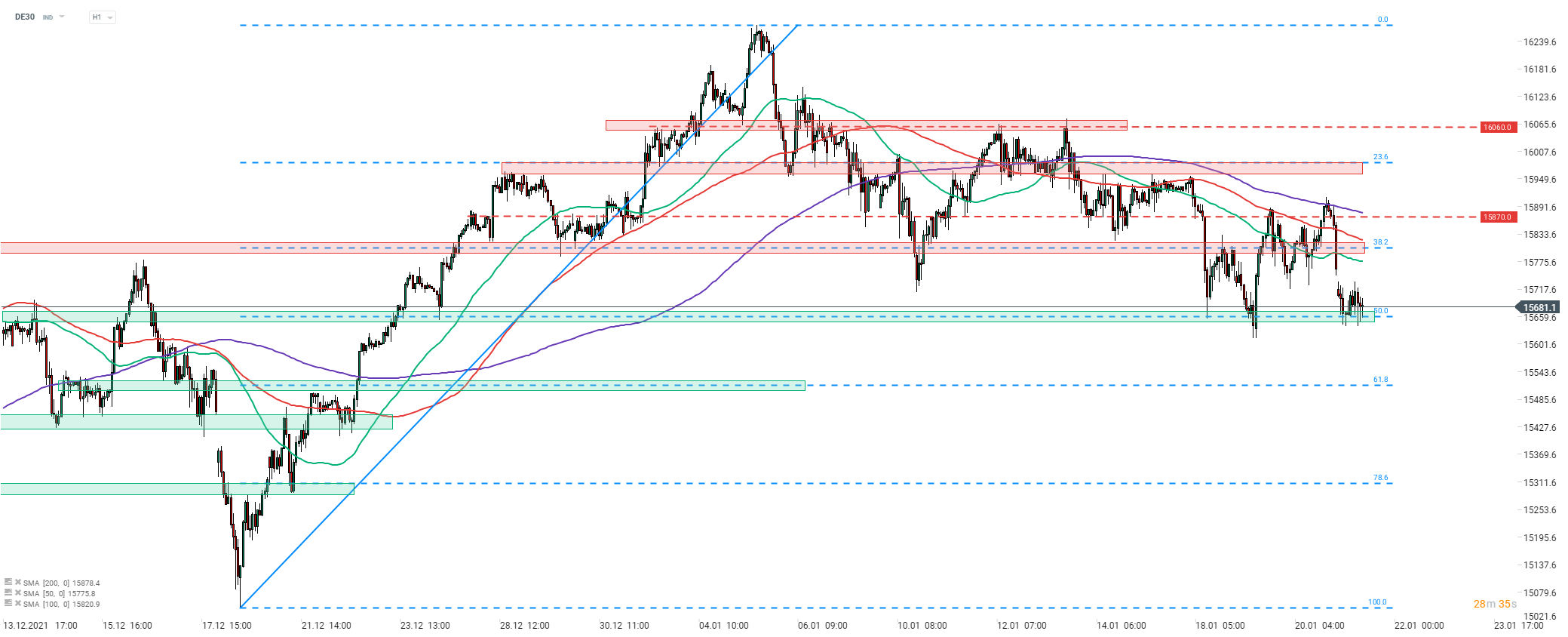 DE30 s-a depreciat în cursul nopții și a deschis sesiunea de tranzacționare de astăzi în scădere. Indicele face un alt test al zonei de suport marcată cu retragere Fibonacci de 50% a mișcării ascendente lansate la jumătatea lui decembrie 2021 (zona de 15.660 de puncte). Se pare că scăderile au fost oprite pentru moment, deoarece vânzătorii încearcă să împingă prețul sub retragere menționată anterior. În cazul în care cumpărătorii reușesc să lanseze o mișcare de recuperare de acolo, mișcarea ascendentă care rezultă ar putea împinge indicele mai sus, spre retragerea Fibonacii de 38,2% (zona de 15.800 de puncte). Pe de altă parte, depășirea în jos a zonei de 15.660 de puncte poate încuraja vânzătorii să genereze un alt impuls și să împingă prețul sub această zonă. Într-un astfel de scenariu, retragerea Fibonacci de 61,8% situată în zona de 15.515 puncte va deveni următorul suport de urmărit.