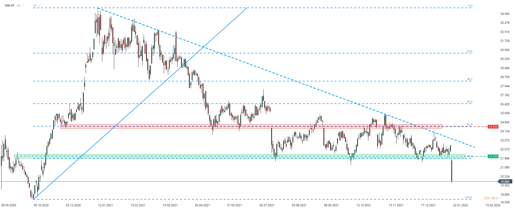 Siemens Energy (ENR.DE) este cel mai slab membru al indicelui DAX în prezent. Compania a avertizat că ,probabil, creșterea prețurilor va determina creșterea pierderilor la divizia sa de turbine eoliene și, de asemenea, a redus previziunile de vânzări pentru anul fiscal 2022. Prețul acțiunilor companiei a scăzut sub limita inferioară a intervalului de tranzacționare marcat cu retragerea Fibonacci de 78,6% a mișcării de creștere de la sfârșitul anului 2020 (limita inferioară, zonă de 22,00 EUR) și retragerea Fibonacci de 61,8% (limită superioară, 24,50 EUR). Următorul suport potențial de urmărit este marcat de minimul din octombrie 2020 situat în zona de 18,35 EUR. Sursa: xStation5