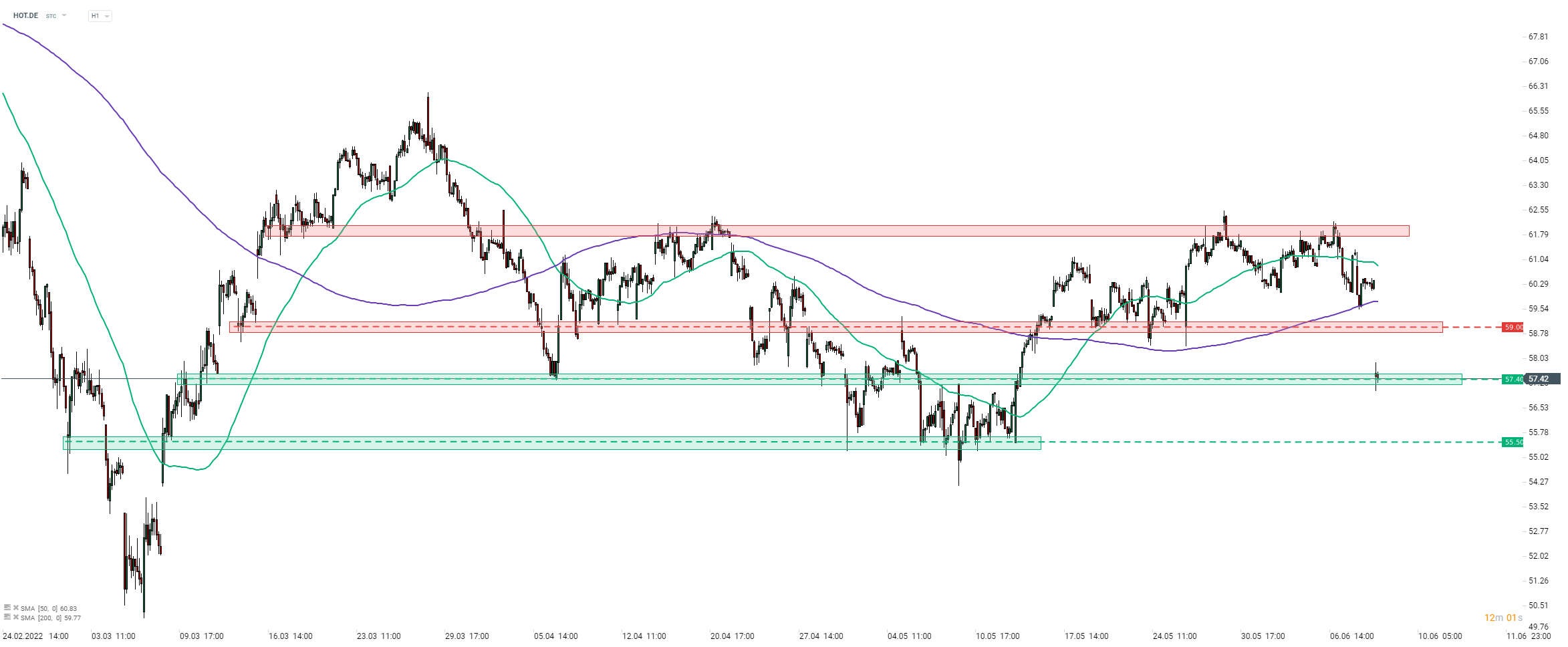 Acțiunile Hochtief (HOT.DE) scad astăzi, după ce compania a anunțat planuri de a emite 7,1 milioane de acțiuni noi. Acțiunile se tranzacționează cu 5% în scădere iar prețul testează zona de suport din jurul nivelului de 57,40 EUR. Prețul a coborât sub media mobilă de 200 de ore care a oferit sprijin recent - o mișcare care poate sugera o perioadă de slăbiciune. Sursa: xStation5