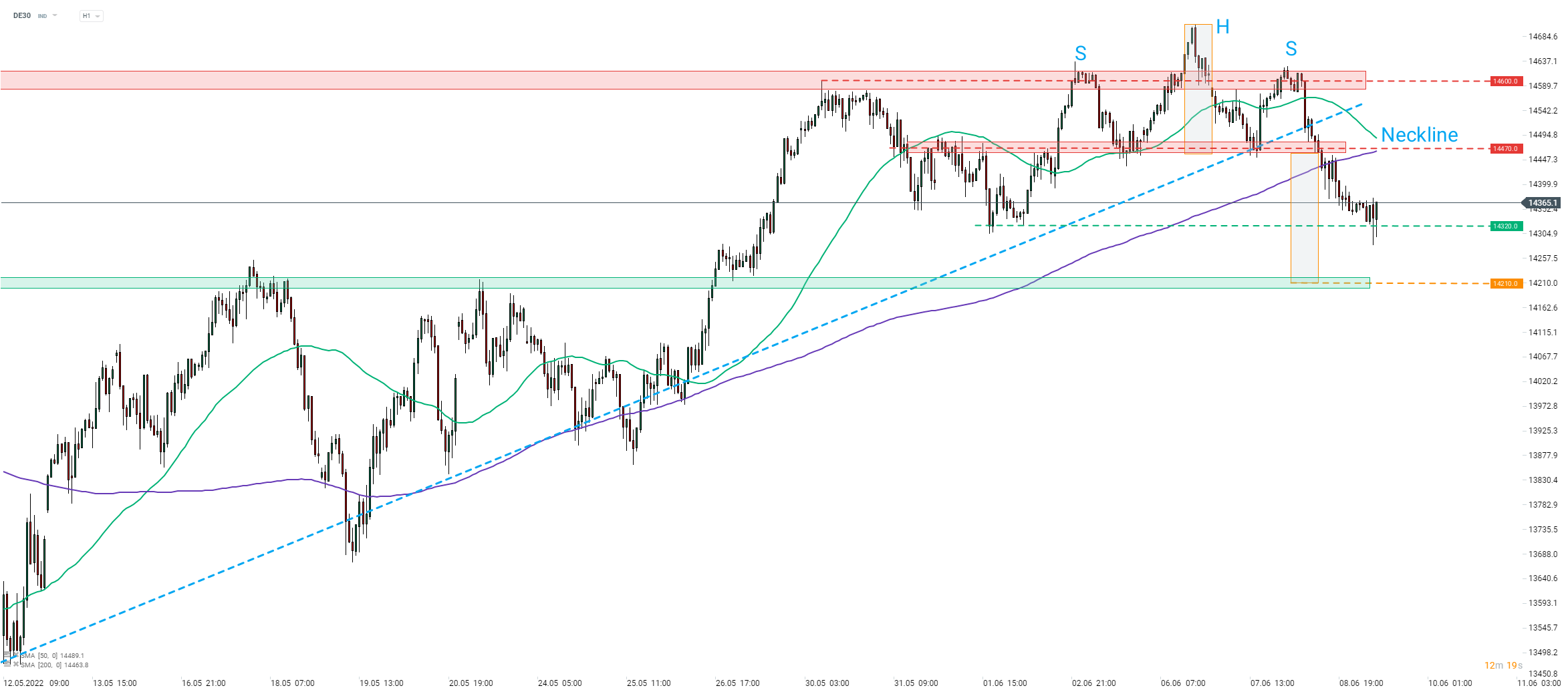 Așa cum am sugerat ieri, DE30 a coborât sub linia de suport a formațiunii Head & Shoulders de 14.470 de puncte și mișcarea în jos a accelerat. În prezent, indicele încearcă să părăsească zona de 14.320 de puncte, zonă marcată cu minimele din 1 și 2 iunie. Evoluția viitoare va depinde acum de decizia BCE. În cazul în care este trimis un mesaj “hawkish”, indicele poate relua mișcarea descendentă și se poate deplasa pentru a atinge ținta teoretică dată de formațiunea de prețuri menționată anterior(14.210 puncte). Pe de altă parte, lipsa unui indiciu clar cu privire la creșterea ratelor ar fi o mare surpriză “dovish” și ar putea ajuta DE30 să recupereze ceva mai mult teren.