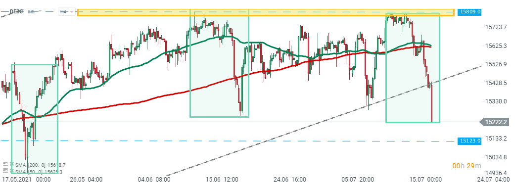 DE30 a pierdut mai mult de 1% astăzi, atingând un minim al ultimelor două luni, pe fondul îngrijorărilor tot mai mari cu privire la focarele de Covid-19. Indicele căzut sub linia de trend ascendentă pe termen lung, care acționează acum ca cea mai apropiată rezistență și testează în prezent limita inferioară a structurii 1: 1. Dacă va apărea o spargere în jos a acesteui prag, atunci următorul suport de urmărit se află la nivelul de 15.123 puncte Sursa: xStation5