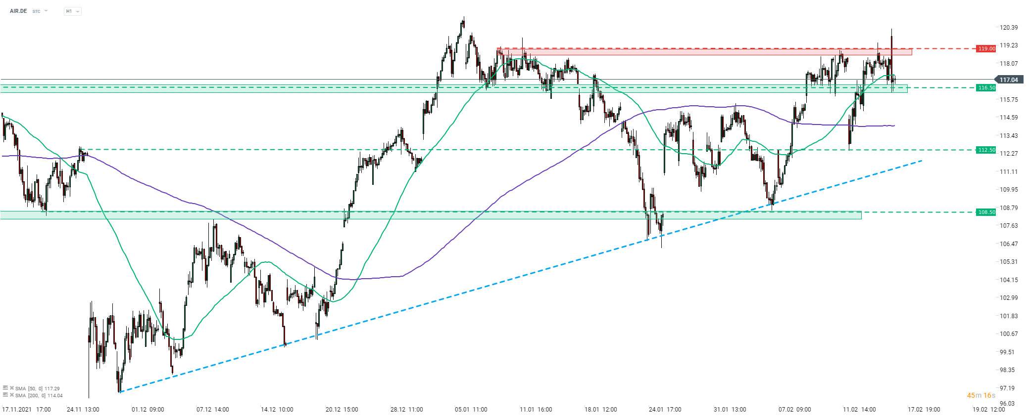 Airbus (AIR.DE) a lansat sesiunea de astăzi în creștere și s-a tranzacționat peste rezistența de la 119 EUR la începutul sesiunii. Cu toate acestea, taurii nu au reușit să păstreze aceste câștiguri, iar acțiunea a scăzut din nou sub rezistența menționată mai sus. Prețul acțiunilor testează în prezent zona de suport de la 116,50 EUR. Sursa: xStation5