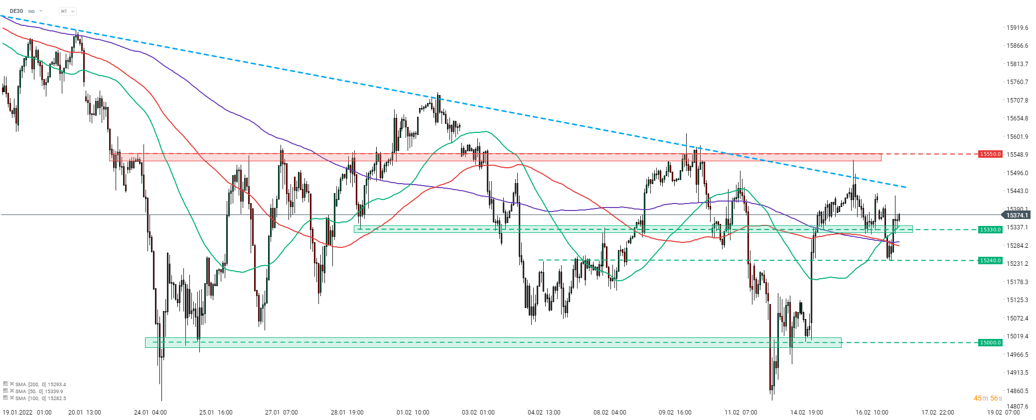 DE30 a scăzut în timpul sesiunii asiatice privind știrile despre bombardamente în partea de est a Ucrainei. Indicele a testat un nivel de fluctuație pe termen scurt la 15.240 de puncte ca suport în această dimineață. Cumpărătorii au reușit să apere zona și să lanseze o mișcare ascendentă. Indicele a revenit peste zona de preț de 15.330 de puncte și acum se tranzacționează mai mult sau mai puțin stabil în comparație cu închiderea de ieri. În cazul în care mișcarea ascendentă se extinde, rezistența pe termen scurt de urmărit poate fi găsită la linia descendentă de trend în zona de 15.450 de puncte. Calendarul economic de astăzi nu are evenimente majore care ar putea declanșa mișcări de preț mai mari, prin urmare traderii ar trebui să se concentreze pe fluxurile de știri ca factori ai mișcărilor de astăzi.