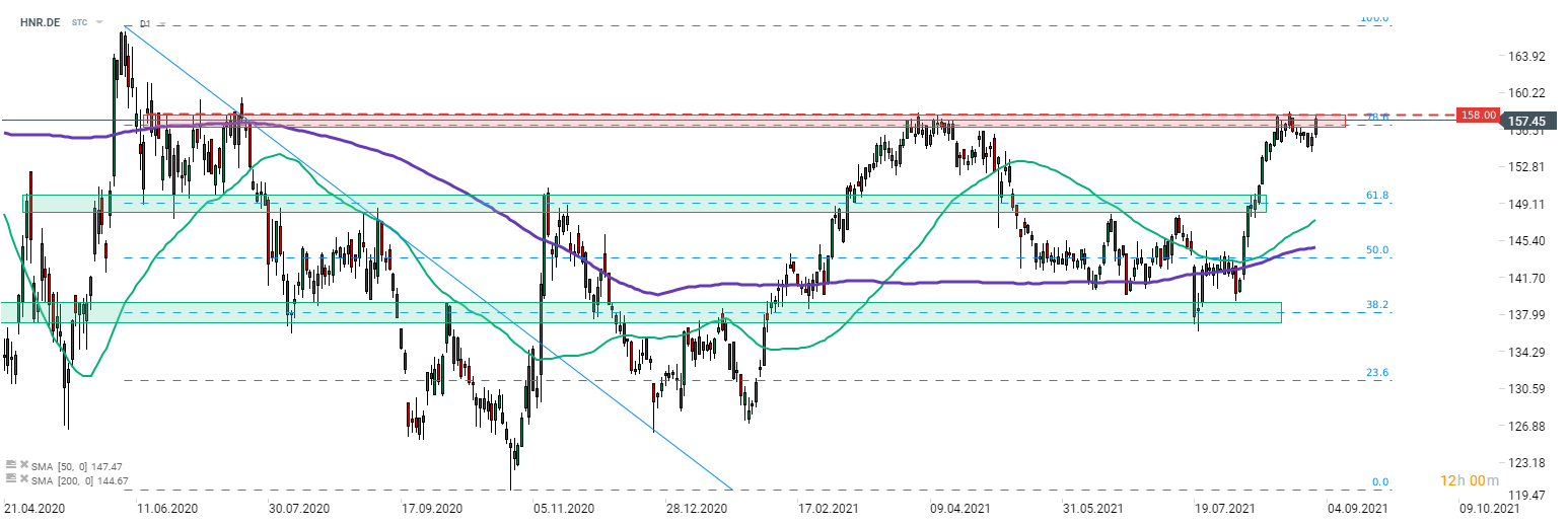 Hannover Re (HNR.DE) se tranzacționează astăzi în creștere. Prețul încearcă din nou să depășească zona de rezistență, situată între retragerea Fibonacci de 78,6% a mișcării descendente lansate în iunie 2020 și pragul de 158 EUR. Spargerea în sus a acestei zone ar însemna marcarea unui nou maxim anual pentru acțiune. Sursa: xStation5