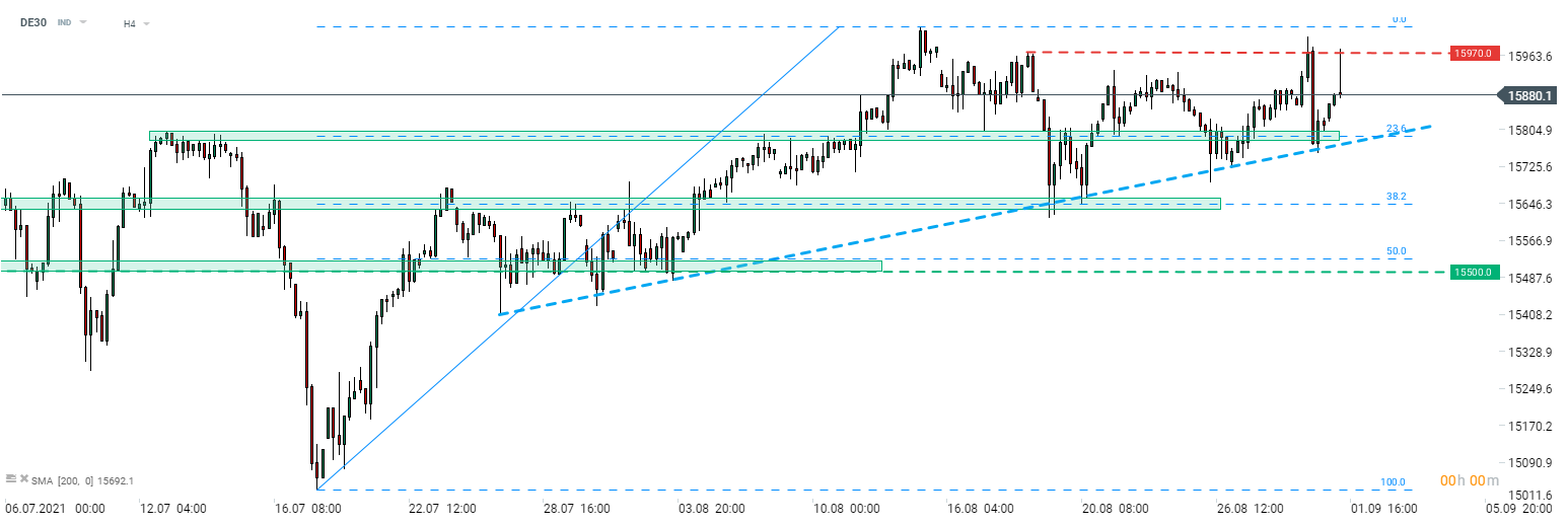 DE30 a recâștigat o mare parte din terenul pierdut ieri în timpul sesiunii asiatice. Indicele a avansat către zona de 15.970 puncte, nivel unde avansul a fost oprit. O retragere a fost inițiată și DE30 a pierdut o mare parte din câștigurile realizate anterior. Aceasta este a doua zi consecutivă când indicele german a cunoscut o mișcare abruptă descendentă care a șters câștigurile anterioare. Cu toate acestea, o privire asupra graficului indicelui pe intervalul H4 ne arată că secvența de maxime în creștere este intactă, sugerând că tendința ascendentă poate continua. Acestea fiind spuse, situația poate deveni îngrijorătoare odată ce indicele scade sub zona de 15.790 puncte, unde se află cel mai recent minim local. În afară de retragere, zona este întărită și de linia ascendentă de trend și retragerea Fibonacci de 23,6% a mișcării ascendente lansate la mijlocul lunii iulie.