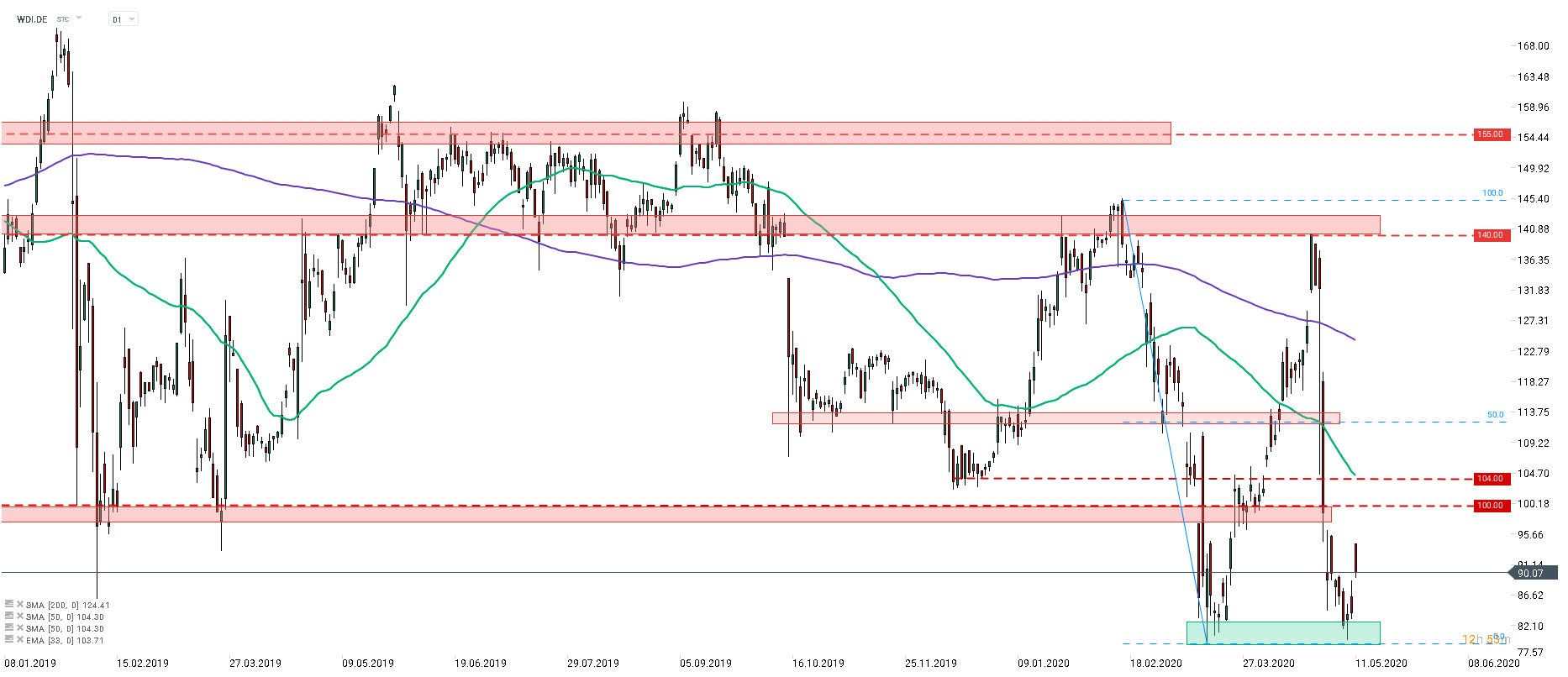 Săptămâna trecută, prețul acțiunilor Wirecard (WDI.DE) a testat minimul din martie. Acțiunea a început sesiunea de astăzi cu o creștere semnificativă, dar, ulterior, a pierdut aceste câștiguri. Zona de 80 € este un nivel cheie de suport. În ciuda faptului că s-au încheiat mai multe acorduri cu firme mai mici și mai mari, sentimentul de piață predominant a fost motivat de rapoartele din ultimele luni ce indică un comportament necorespunzător. Sursa: xStation5