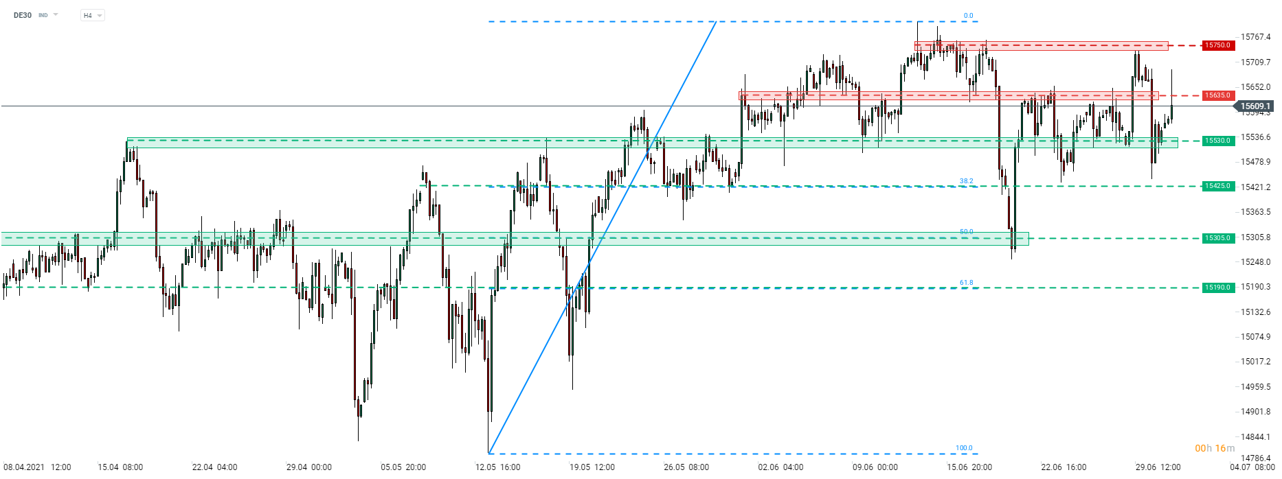 În timp ce DE30 performează bine astăzi, situația tehnică nu s-a schimbat semnificativ. După testarea zonei de 15.750 de puncte, marți, indicele a coborât și a testat retragerea Fibonacci de 38,2% a mișcării recente ascendente situată la aproximativ 15.425 de puncte. Vânzătorii nu au reușit să ducă prețul mai jos, iar DE30 a început să recupereze. Mișcarea din cursul dimineții a împins indicele deasupra limitei superioare a intervalului de tranzacționare recent de la 15.635 puncte, dar, din nou, am asistat ulterior la o inversare. DE30 continuă să se tranzacționeze într-un interval restrâns între 15.530 - 15.635 puncte pe termen scurt. Până în prezent, spargerile din acest interval au fost limitate fie de rezistența de la 15.750 de puncte, fie de suportul situat la 15.425 de puncte, prin urmare, investitorii ar trebui să rămână prudenți până când se produce o spargere a unuia dintre cele două niveluri.