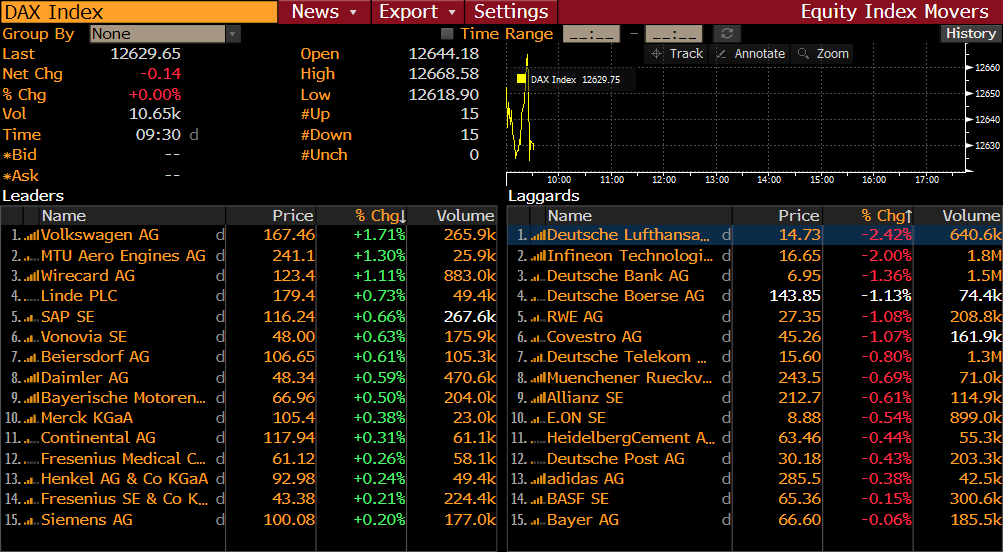 Membrii DAX după prima jumătate de oră a sesiunii. Sursă: Bloomberg