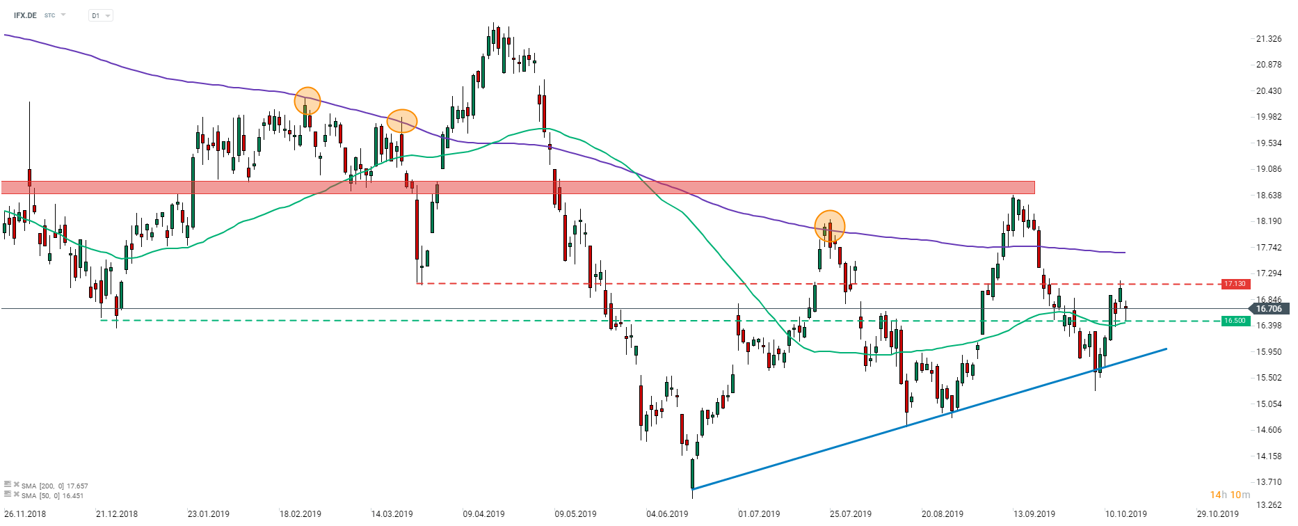 Infineon Technologies (IFX.DE) nu a reușit să depășească valoarea de 17,13 EUR, marcată ca fiind valoarea minimă locală de la sfârșitul lunii martie. Acțiunea a testat nivelul de 16,50 euro, marcat ca fiind minim local de la sfârșitul anului 2018 și 2019, în tranzacționarea timpurie de astăzi, dar vanzatorii nu au avut suficientă putere pentru a împinge prețul mai jos. Rețineți că media mobilă de 50 de perioade (linia verde) poate fi găsită ușor mai scăzută. Acestea fiind spuse, zona de 16,50 euro ar putea constitui un suport semnificativ. Un salt și o spargere peste nivelul de 17,13 euro ar deschide calea către rezistența cheie - media mobilă de 200 de perioade (linie violet). Sursa: xStation5