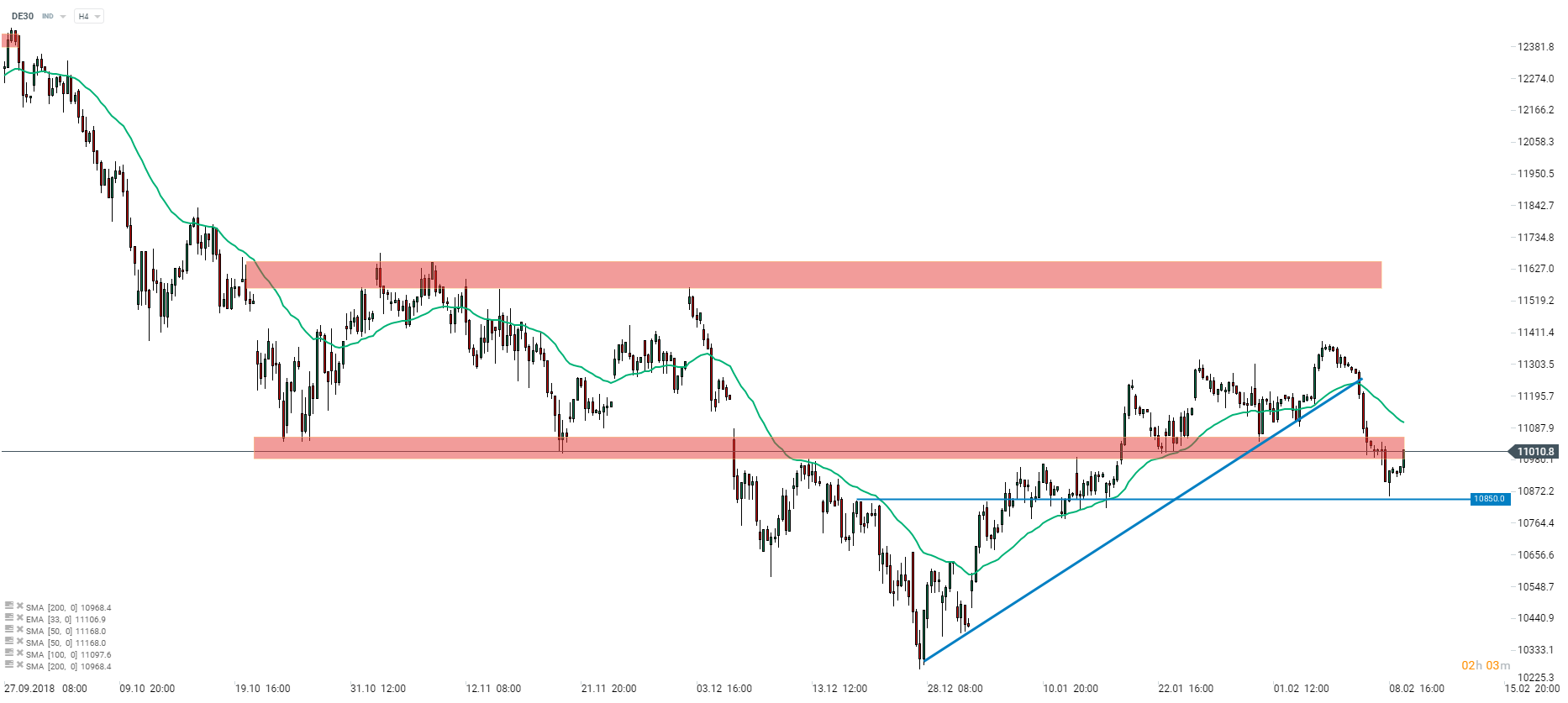 La sfârșitul săptămânii trecute, cotația DE30 a spart zona de suport de la 11 mii de puncte. Acea mișcare descendentă a fost oprită de nivelul de 10850 de puncte, iar un impuls de revenire a readus prețul în zona de 11 mii. Modul în care prețul va reacționa în vecinătatea acestei zone tehnice ar putea fi definitorie pentru direcția viitoare. Sursa: xStation5