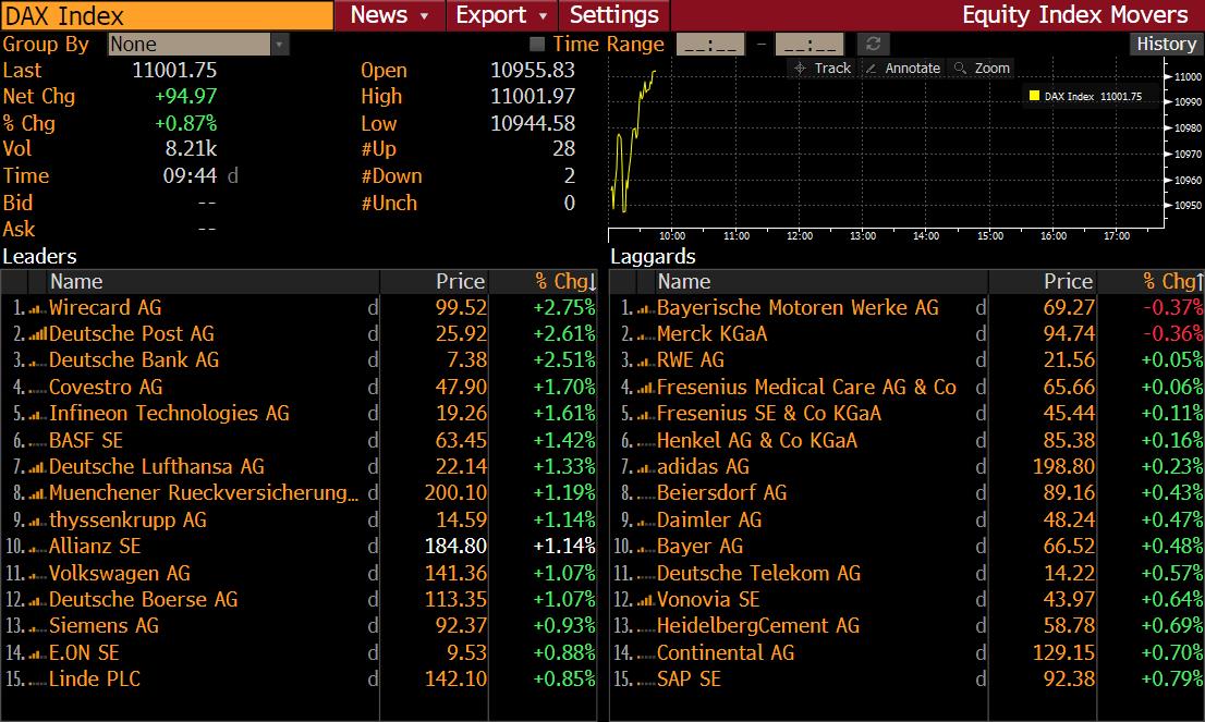 Acțiunile Wirecard (WDI.DE) și Deutsche Post (DPW.DE) înregistrează cele mai bune evoluții de luni dimineață dintre companiile din componența DAX. Sursa: Bloomberg