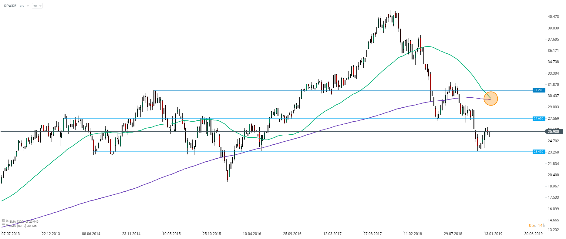 La sfârșitul anului 2018, prețul acțiunilor Deutsche Post (DPW.DE) a fost respins de nivelul de suport de la 23,40 de dolari. Începutul săptămânii a adus un decalaj pozitiv de 2,5%. Chiar dacă zvonurile cu privire la majorarea tarifelor poștale sunt îmbucurătoare pentru investitori, mediile mobile de 200 și 50 de perioade s-ar putea intersecta. O posibilă formațiune ”death cross” este un semnal bearish. Sursa: xStation5