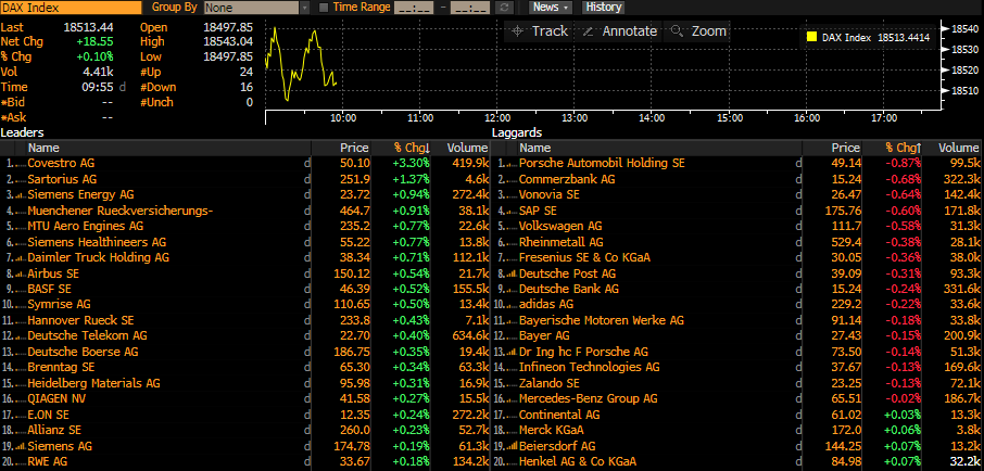 Majoritatea acțiunilor din indicele DAX înregistrează o ușoară revenire. Cu toate acestea, în cele mai multe cazuri, acestea sunt doar îmbunătățiri după scăderile de ieri. Sursa: Bloomberg Finance L.P.