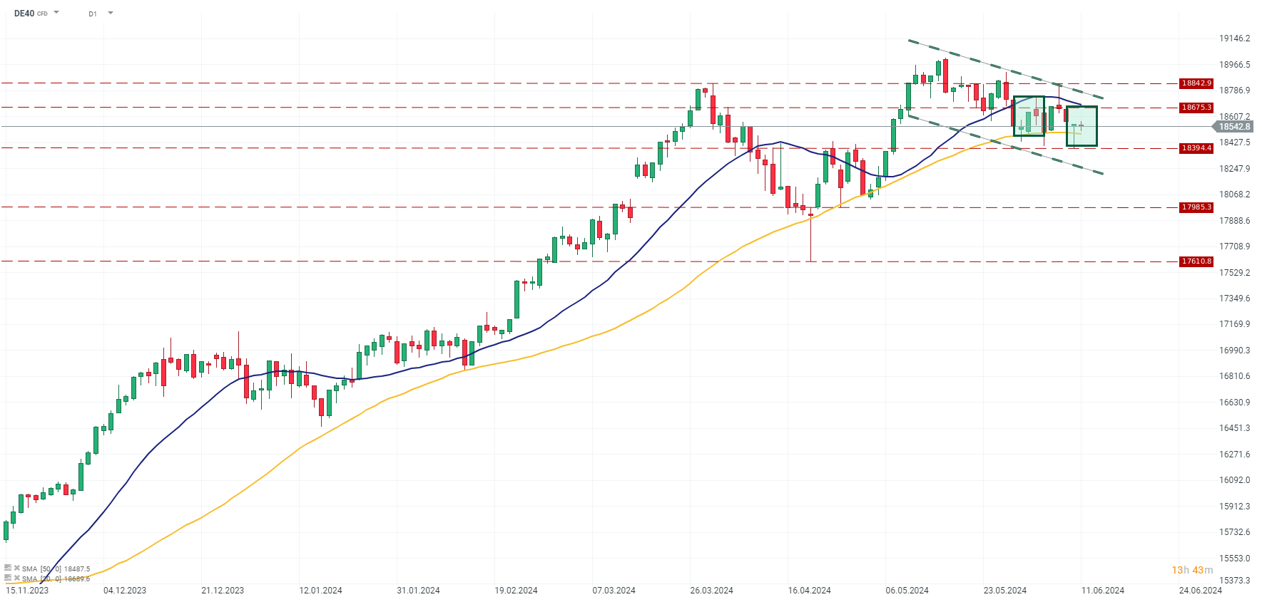 Indicele DAX (DE40), care reproduce contractul, arată o ușoară revenire de la nivelul de suport din jurul valorii de 18.394,4 puncte, care a fost indicat de maximele locale din aprilie. Acum, contractul se tranzacționează între indicatorii SMA50 și SMA20. Aceste medii susțin un canal lateral între 18.394,4 puncte și 18.675,3 puncte. Geometria pieței indică, de asemenea, că, pe termen scurt, contractul ar putea fi reținut de nivelul de rezistență de 18.675 puncte. Cu toate acestea, dacă DE40 vede o cerere mai puternică și depășește acest nivel, mai are încă ceva spațiu înainte de a indica ieșirea din canalul descendent creat la începutul lunii mai. Sursa: xStation