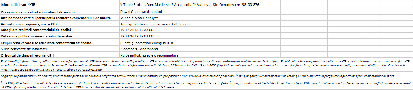 "Acest material este o comunicare de marketing în sensul articolului 24 alineatul (3) din Directiva 2014/65 / UE a Parlamentului European și a Consiliului din 15 mai 2014 privind piețele de instrumente financiare, și de modificare a Directivei 2002/92 / CE și a Directivei 2011 / 61 / UE (MiFID II). Comunicarea de marketing nu este o recomandare de investiții sau o recomandare de informații sau o recomandare care sugerează o strategie de investiții în sensul Regulamentului (UE) nr. 596/2014 al Parlamentului European și al Consiliului din 16 aprilie 2014 privind abuzul de piață ( reglementarea abuzului de piață) și de abrogare a Directivei 2003/6 / CE a Parlamentului European și a Consiliului și a Directivelor Comisiei 2003/124 / CE, 2003/125 / CE și 2004/72 / CE și a Regulamentului delegat (UE) 2016/958 al Comisiei din 9 596/2014 al Parlamentului European și al Consiliului în ceea ce privește standardele tehnice de reglementare pentru aranjamentele tehnice pentru prezentarea obiectivă a recomandărilor de investiții sau a altor informații care sugerează strategii de investiții și pentru dezvăluirea de interese particulare sau indicații de conflicte de interese sau orice alte sfaturi, inclusiv în domeniul consultanței în materie de investiții, în sensul Legii privind tranzacționarea cu instrumente financiare din 29 iulie 2005 (de ex. Journal of Laws 2019, articolul 875, astfel cum a fost modificat). Comunicarea de marketing este pregătită cu cea mai mare diligență, obiectivitate, prezintă faptele cunoscute autorului la data pregătirii și este lipsită de orice elemente de evaluare. Comunicarea de marketing este pregătită fără a lua în considerare nevoile clientului, situația sa financiară individuală și nu prezintă nicio strategie de investiții în niciun fel. Comunicarea de marketing nu constituie o ofertă de vânzare, oferire, abonament, invitație la cumpărare, reclamă sau promovare a oricărui instrument financiar. XTB SA nu este responsabilă pentru acțiunile sau omisiunile niciunui client, în special pentru achiziționarea sau cedarea instrumente, întreprinse pe baza informațiilor conținute în această comunicare de marketing. XTB SA nu va accepta răspunderea pentru nicio pierdere sau daună, inclusiv, fără limitare, orice pierdere care poate apărea direct sau indirect, efectuată pe baza informațiilor conținute în această comunicare de marketing. În cazul în care comunicarea de marketing conține informații despre orice rezultat cu privire la instrumentele financiare indicate în acestea, acestea nu constituie nicio garanție sau prognoză cu privire la rezultatele viitoare. Performanțele anterioare nu indică neapărat rezultatele viitoare și orice persoană care acționează pe baza acestor informații o face pe propriul risc. Acest material nu este emis pentru a influenta deciziile de tranzacționare ale niciunei persoane. Informațiile cuprinse în cadrul acestui material nu sunt prezentate pentru a fi aplicate, copiate sau testate în cadrul tranzacțiilor dumneavoastră. Informațiile cuprinse în cadrul acestui material sunt emise în baza experienței proprii a emitentului și nu reprezintă o recomandare individuală, nu vizează atingerea anumitor obiective, randamente financiare și nu se adresează nevoilor niciunei persoane anume care ar primi-o. Premisele acestui material nu au în vedere situația și persoana dumneavoastră deci nu recomandăm utilizarea acestor informații sub orice formă. Utilizarea informațiilor cuprinse în cadrul acestui material în orice modalitate se face pe propria dumneavoastră răspundere. Acest material este emis de către un analist pentru care își asumă răspunderea XTB SA, persoană juridică autorizată de KNF – Autoritatea de Supraveghere Financiara din Polonia."