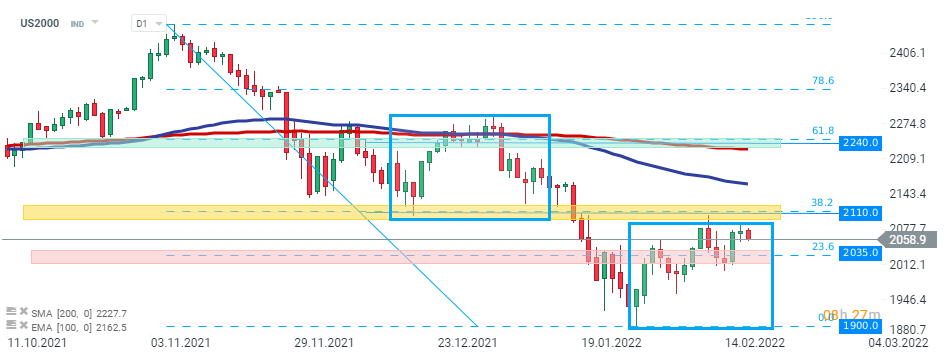 US2000 s-a retras după o încercare eșuată de a depăși limita superioară a structurii 1:1 și se îndreaptă în prezent către suportul local la 2.035 de puncte care este marcat cu o retragere Fibonacci de 23,6% a ultimului val descendent. În cazul în care are loc o spargere în jos, mișcarea descendentă poate accelera spre limita inferioară a structurii menționate mai sus în jur de 1.900 de puncte. Sursa: xStation5
