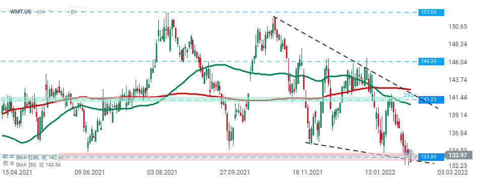 Acțiunile Walmart (WMT.US) s-au mișcat lateral în ultimele luni. În prezent, prețul testează limita inferioară a zonei de consolidare în jurul a 133,80 USD, care coincide cu o retragere Fibonacci de 38,2% a valului ascendent lansat în martie 2020 și limita inferioară a formațiunii de triunghi. În cazul în care cumpărătorii reușesc să recapete controlul, atunci ar putea fi lansat un alt impuls ascendent către rezistența de la 141,25 USD. Sursa: xStation5