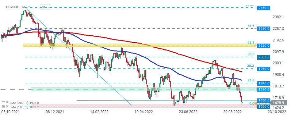 US2000 testează din nou suportul cheie de la 1.650 de puncte, unde se află minimele din iunie 2022. Atâta timp cât indicele se află deasupra acestui nivel, un alt impuls ascendent poate fi lansat către rezistența de la 1.790, care este marcată de reacții anterioare ale prețului. Sursa: xStation5