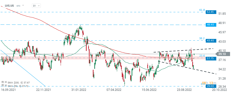 Acțiunile Las Vegas Sands (LVS.US) au lansat sesiunea de astăzi cu un gap bullish de preț și a depășit rezistența majoră de la 37,75 USD, unde se află retragerea Fibonacci de 23,6% a ultimului val descendent. În cazul în care sentimentul actual predomină, mișcarea ascendentă poate accelera spre limita superioară a formațiunii Widening Wedge. Sursa: xStation5