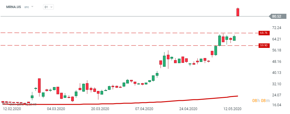 Acțiunile Moderna (MRNA.US) au crescut cu peste 25% și se află la maximele istorice. Suportul local poate fi identificat la 68,76 USD pe acțiune. Sursa: xStation5