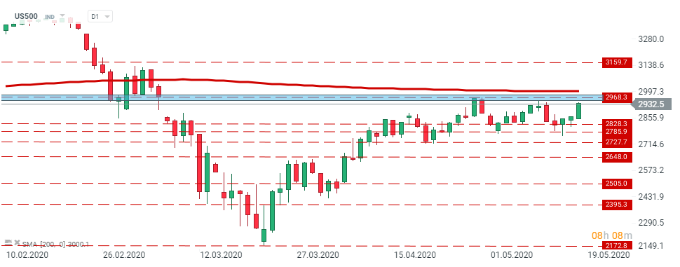 S&P500 (US500) se tranzacționează în creștere luni, după ce compania biotehnologică Moderna a spus că rezultatele primului studiu uman pentru potențialului său vaccin covid-19 sunt promițătoare. În cazul în care optimismul continuă, poate intra în joc rezistența de la 2968,3 puncte. Sursa: xStation5