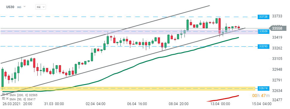 US30 a atins ieri un nou maxim istoric, totuși indicele a revenit rapid la limita inferioară a canalului ascendent. În cazul în care apare o spargere în jos, atunci mișcarea descendentă poate fi extinsă la nivelul de 33.293 puncte. Cu toate acestea, în cazul în care cumpărătorii vor reuși să oprească declinurile aici, atunci ar putea fi lansat un alt impuls ascendent către 33.278 puncte. xStation5