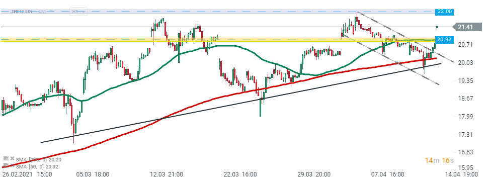 Acțiunile JetBlue Airways (JBLU.US) au deschis sesiunea de astăzi, cu un gap pozitiv de 3%. Pe de altă parte, dacă vânzătorii vor reuși să recâștige controlul, atunci cel mai apropiat suport este la 20,92 USD Sursa: xStation5
