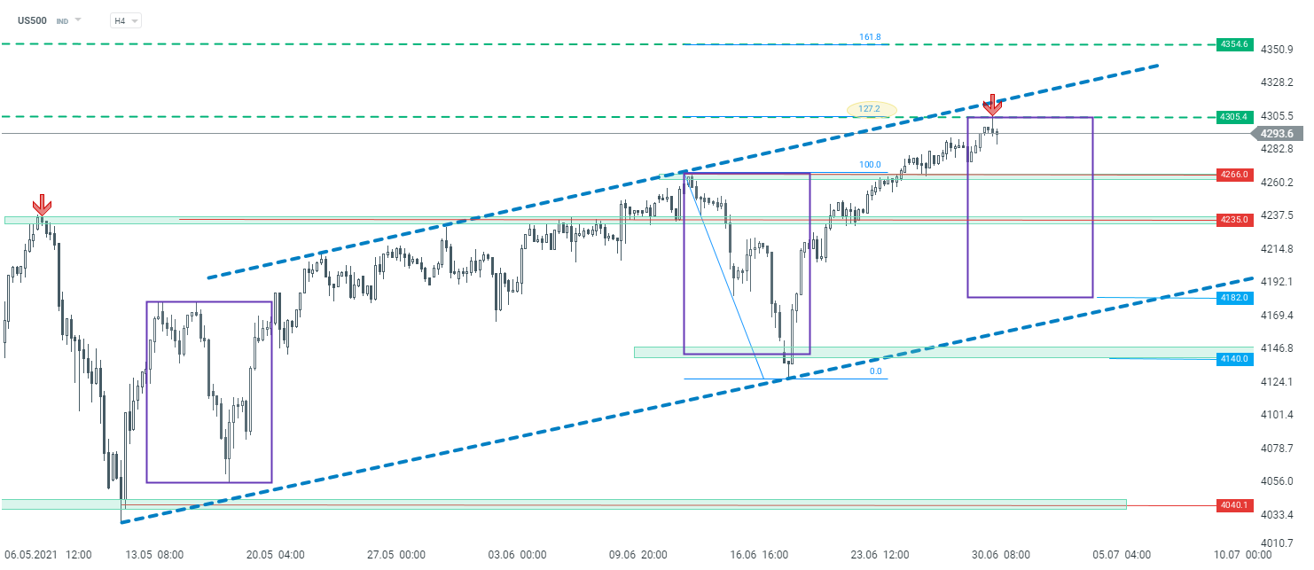 Piețele de acțiuni din SUA au început a doua jumătate a anului 2021 în cea mai mare parte într-o notă pozitivă. S&P 500 (US500) a închis al doilea trimestru cu 8,2% mai sus. Câștigurile din prima jumătate a anului s-au ridicat la 14,4%. Datele de astăzi privind numărul cererilor de șomaj au oferit indicilor combustibil pentru a continua avansul deoarece numărul americanilor care depun cereri noi pentru ajutor de șomaj a scăzut la un nou minim post-pandemic de 364 mii săptămâna trecută. Cu toate acestea, indicatorul PMI pentru sectorul manufacturier, versiunea finală, pentru luna iunie a venit ușor sub valoarea flash (62,1 față de 62,6 conform datelor preliminare).