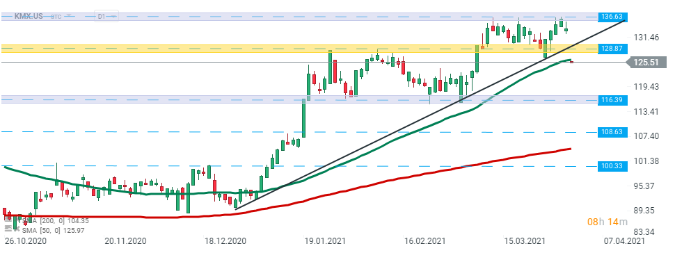 Acțiunile CarMax (KMX.US) au deschis sesiunea de astăzi cu un gap negativ. Prețul a scăzut sub suportul major de la 128,87 USD și linia ascendentă de trend. În cazul în care sentimentul actual prevalează, este posibil ca suportul de la 116,39 USD să fie în pericol. Pe de altă parte, în cazul în care cumpărătorii vor reuși să recâștige controlul și să ducă prețul deasupra liniei de trend menționate anterior, atunci ar putea fi lansată o altă mișcare ascendentă către maximul istoric de la 136,63. Sursa: xStation5