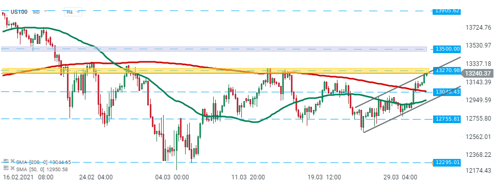 US100 a reușit să depășească nivelul de rezistență major de la 13.046 puncte și media mobilă de 200 de perioade (linia roșie) în timpul sesiunii de ieri. Astăzi, indicele se apropie de o altă rezistență puternică, cea de la nivelul de 13.270 puncte, care coincide cu limita superioară a canalului ascendent. În cazul în care apare o depășire a acestei bariere, mișcarea ascendentă poate fi extinsă către nivelul de 13.500 de puncte. Pe de altă parte, dacă vânzătorii vor reuși să recâștige controlul, atunci ar putea fi lansat un alt impuls descendent către limita inferioară a canalului. Sursa: xStation5