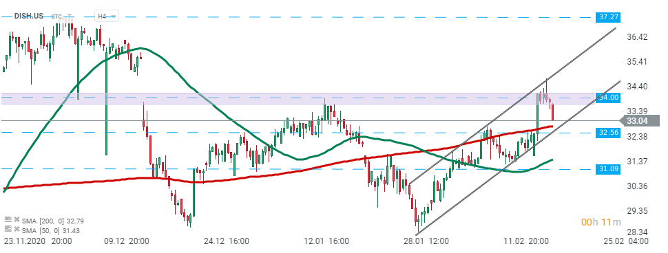 Acțiunile Dish Networks (DISH.US) au deschis sesiunea de astăzi cu o scădere puternică și se apropie de limita inferioară a canalului ascendent. O spargere în jos ar putea deschide drumul către suportul de la 31,09 USD. Pe de altă parte, în cazul în care cumpărătorii reușesc să oprească mișcarea descendentă acolo, prețul acțiunilor ar putea avansa spre rezistența majoră de la 34,00 USD. Sursa: xStation5