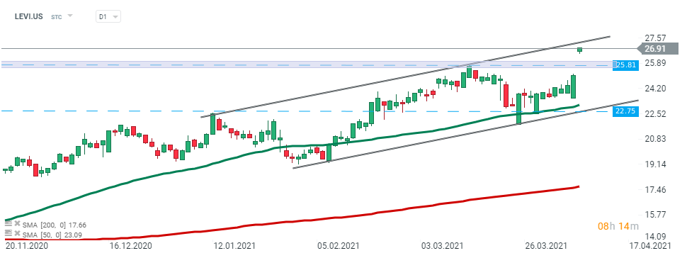 Acțiunile Levi Strauss (LEVI.US) au deschis sesiunea de astăzi cu un gap pozitiv și au atins un nou maxim istoric. Dacă sentimentul curent predomină, mișcarea ascendentă poate fi extinsă către limita superioară a canalului ascendent. Pe de altă parte, dacă vânzătorii vor reuși să preia controlul, cel mai apropiat suport este la 25,81 USD. Sursa: xStation5