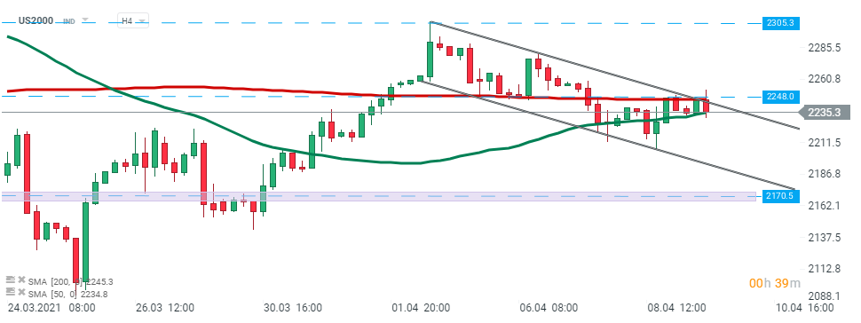 US2000 a ricoșat din rezistența majoră de la 2.248 puncte, care coincide cu media mobilă de 200 de perioade (linia roșie) și limita superioară a canalului descendent și testează în prezent media mobilă de 50 de perioade (linia verde). Dacă se produce o spargere în jos a acestei bariere, atunci mișcarea descendentă poate fi extinsă către limita inferioară a canalului sau chiar până la suportul de la 2.170,5 puncte. Pe de altă parte, în cazul în care cumpărătorii reușesc să ducă prețul decisiv deasupra zonei de rezistență menționate anterior, atunci poate fi lansat un alt impuls ascendent către rezistența de la 2.305 puncte. Sursa: xStation5