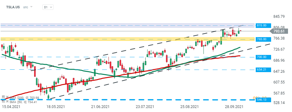 Acțiunile Tesla (TSLA.US) s-au tranzacționat recent într-o tendință ascendentă, însă cumpărătorii încearcă să depășească rezistența majoră de la 815,00 USD, care coincide cu limita superioară a canalului ascendent. În prezent, prețul se îndreaptă către suportul local de la 765,00 USD, care este marcat de reacțiile anterioare ale prețului. Dacă se produce o spargere în jos a acestui nivel, atunci mișcarea descendentă poate accelera către zona de suport situată în jurul nivelului psihologic de 700,00 USD. Sursa: xStation5