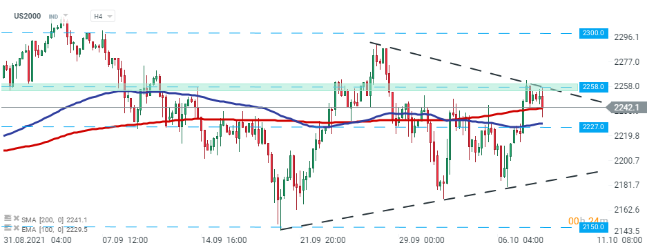 US2000 a ricoșat din rezistența locală de la 2.258 puncte, nivel care coincide cu limita inferioară a triunghiului, după publicarea raportului NFP. Indicele testează în prezent media mobilă de 200 de perioade (linia roșie). În cazul în care se produce o spargere în jos, mișcarea descendentă poate fi extinsă până la nivelul de 2.227 puncte sau chiar limita inferioară a triunghiului. Sursa: xStation5