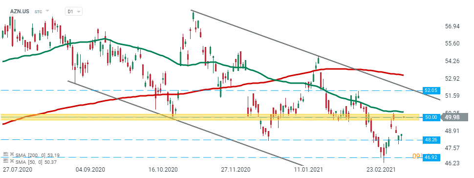 AstraZeneca (AZN.US) a deschis sesiunea de astăzi cu un gap pozitiv și în prezent testează rezistența de la 50,00 USD, care coincide cu media mobilă de 50 de perioade (linia verde). Dacă sentimentul actual prevalează, mișcarea ascendentă ar putea fi extinsă către pragul de 52,05 USD, care este suplimentar consolidat de limita superioară a canalului descendent. Cu toate acestea, dacă vânzătorii vor reuși să oprească avansurile, atunci poate fi lansat un alt impuls descendent către suportul de la 48,26 USD. Sursa: xStation5