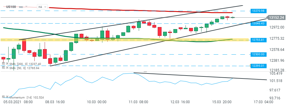 US100 - ieri indicele a ricoșat din limita inferioară a formațiunii Rising Wedge, totuși, uitându-ne la indicatorul de intensitate, se pare că mișcarea ascendentă se estompează. În cazul unei spargeri a limitei inferioare a formațiunii menționate anterior, mișcarea descendentă poate accelera spre suportul de la 12.755 puncte. Pe de altă parte, în cazul în care cumpărătorii reușesc să mențină impulsul, atunci rezistența locală de la 13.270, poate fi sub asediu. Sursa: xStation5
