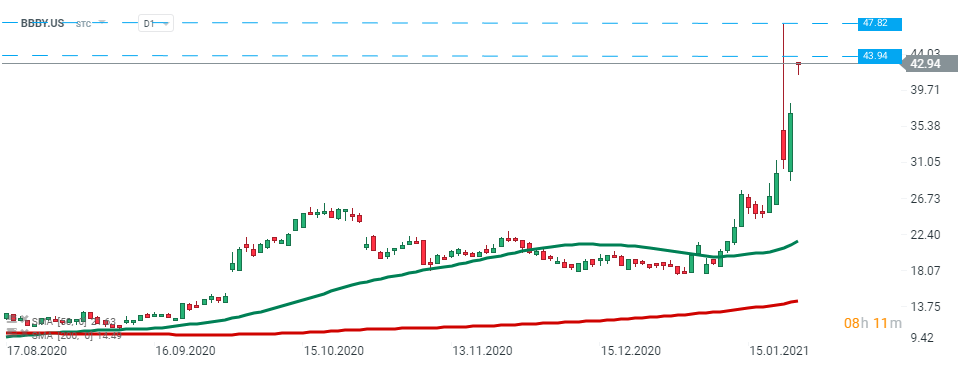 Bed Bath & Beyond (BBBY.US) este una dintre companiile al căror preț al acțiunilor a cunoscut recent mișcări sălbatice. Acțiunile au deschis sesiunea de astăzi în creștere și se apropie de maximul recent de la 47,82 USD. Sursa: xStation5