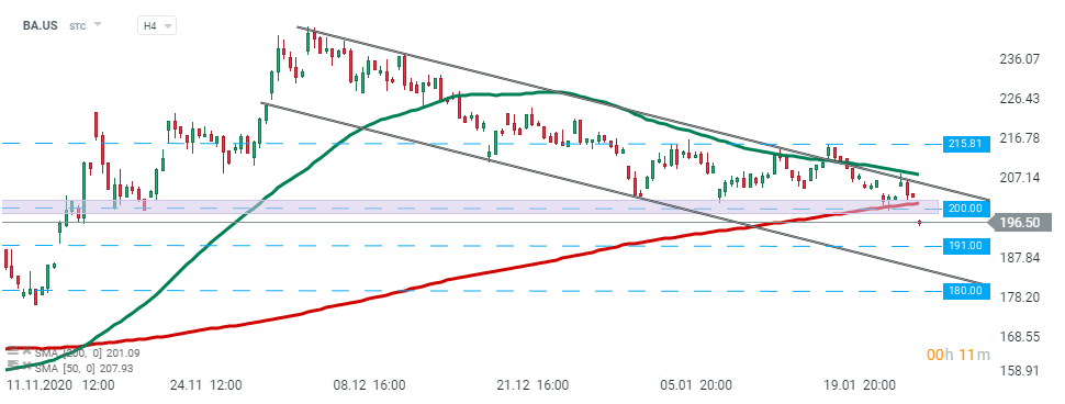 Boeing (BA.US) - ieri, cumpărătorii nu au reușit să depășească limita superioară a canalului descendent și astăzi piața a deschis sesiunea sub suportul major de la 200 USD, care coincide cu media mobilă de 200 de perioade (linia roșie). Dacă prevalează sentimentul actual, mișcarea descendentă ar putea fi extinsă către pragul de 191,00 USD sau chiar către suportul de la 180 USD, unde se află și limita inferioară a canalului menționat anterior. Sursa: xStation5